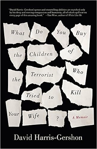 This is the central event in Harris-Gershon’s memoir, What Do You Buy the Children of the Terrorist Who Tried to Kill Your Wife? It is a story about how a great personal trauma can lead to a personal journey that upends long-held beliefs and ideas. The terrific thing about this book is that the author manages to tell his story without sentimentality, grandiose pronouncements, or false humility. He pulls the reader in with his unpretentious, laconic style, and with his refusal to shy away from acknowledging his own flaws.