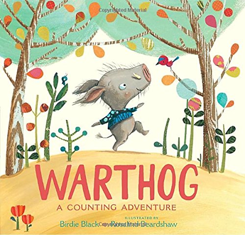 Warthog is a counting book (numbers one to ten). It’s written in rhyme and has a lovely bouncy read-aloud rhythm. Young Warthog goes a-wandering one day and, as he marvels at the animals and plants around him, he unintentionally strays too far from home. He loses track of time and soon it’s very late. He then finds himself in a spot of bother when he follows some large paw prints into a cave…